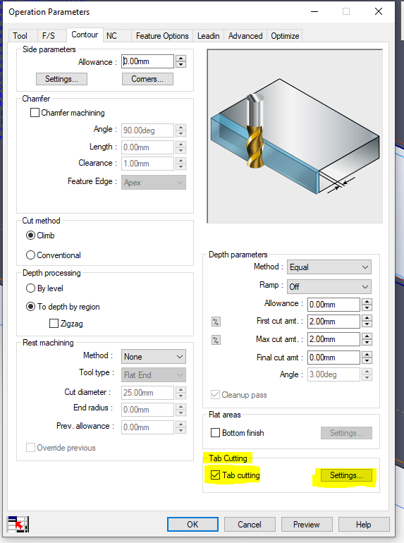 Vart hittar man denna inställning? jo, inställningen finns i en Contour Mill operation. Så på alla features du kan göra en Contour Mill har du tillgång till denna inställning. Väldigt skönt. Du slipper att pilla med flera sketch konturer då för att få till bra Tabs. Bilden nedan ser du var denna inställning finns i Operation Parameters ifrån en Contour Mill.