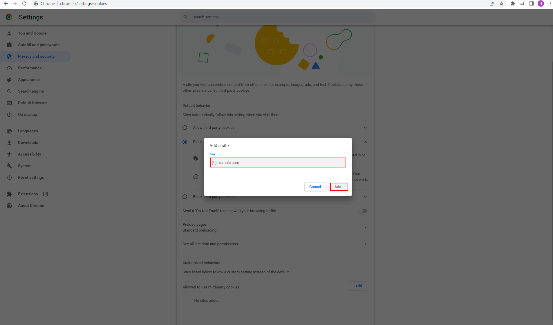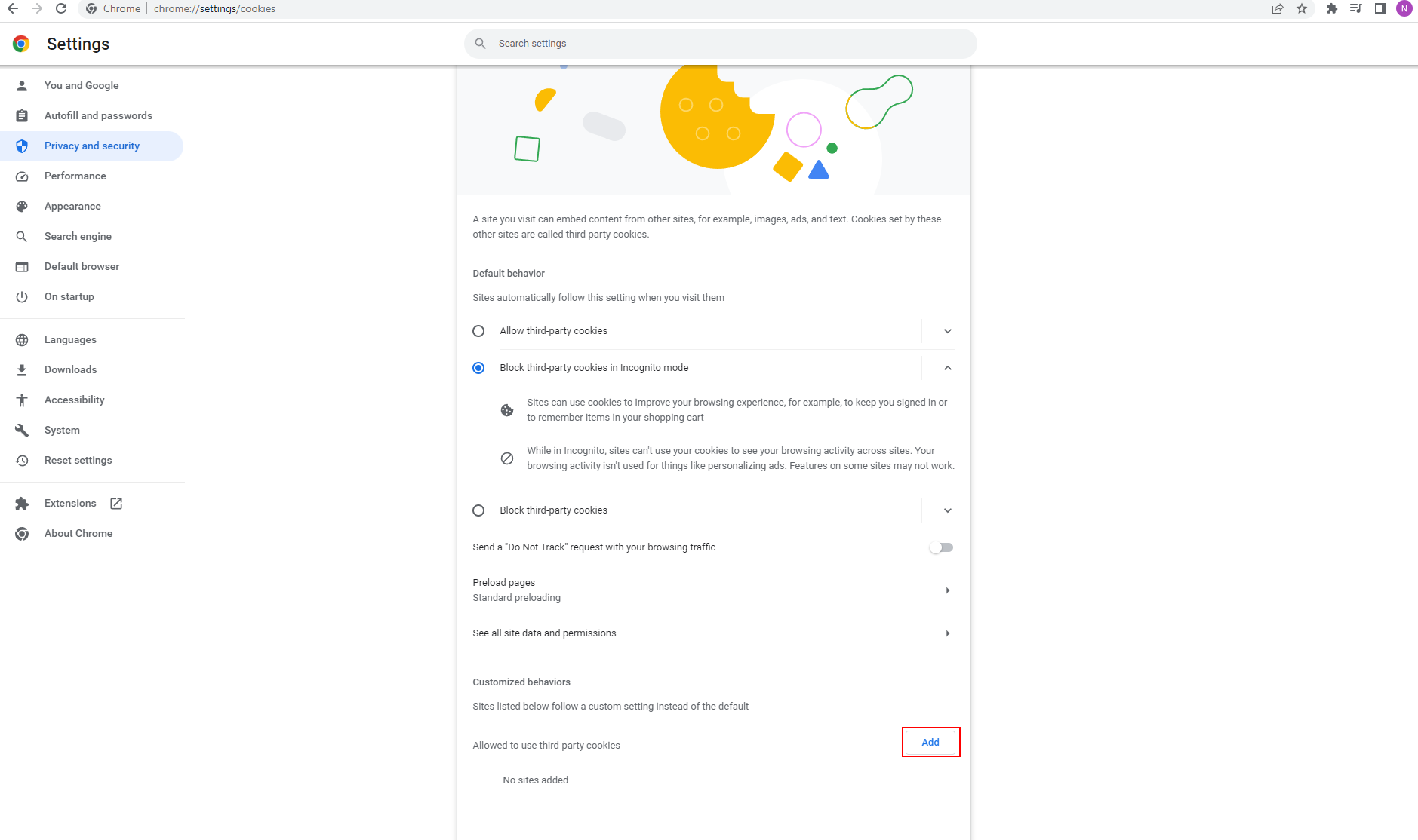 - Gå längst ner på sidan och tryck på knappen Add till höger om Allowed to use third-party cookies.
