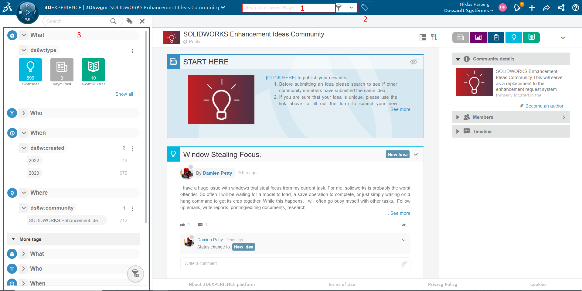 Sedan tidigare i år har en 3DExperience plattform skapats för dessa ideér som heter 3DExperience Enhancement Ideas Community. Här kan man söka och rösta på tidigare förslag.