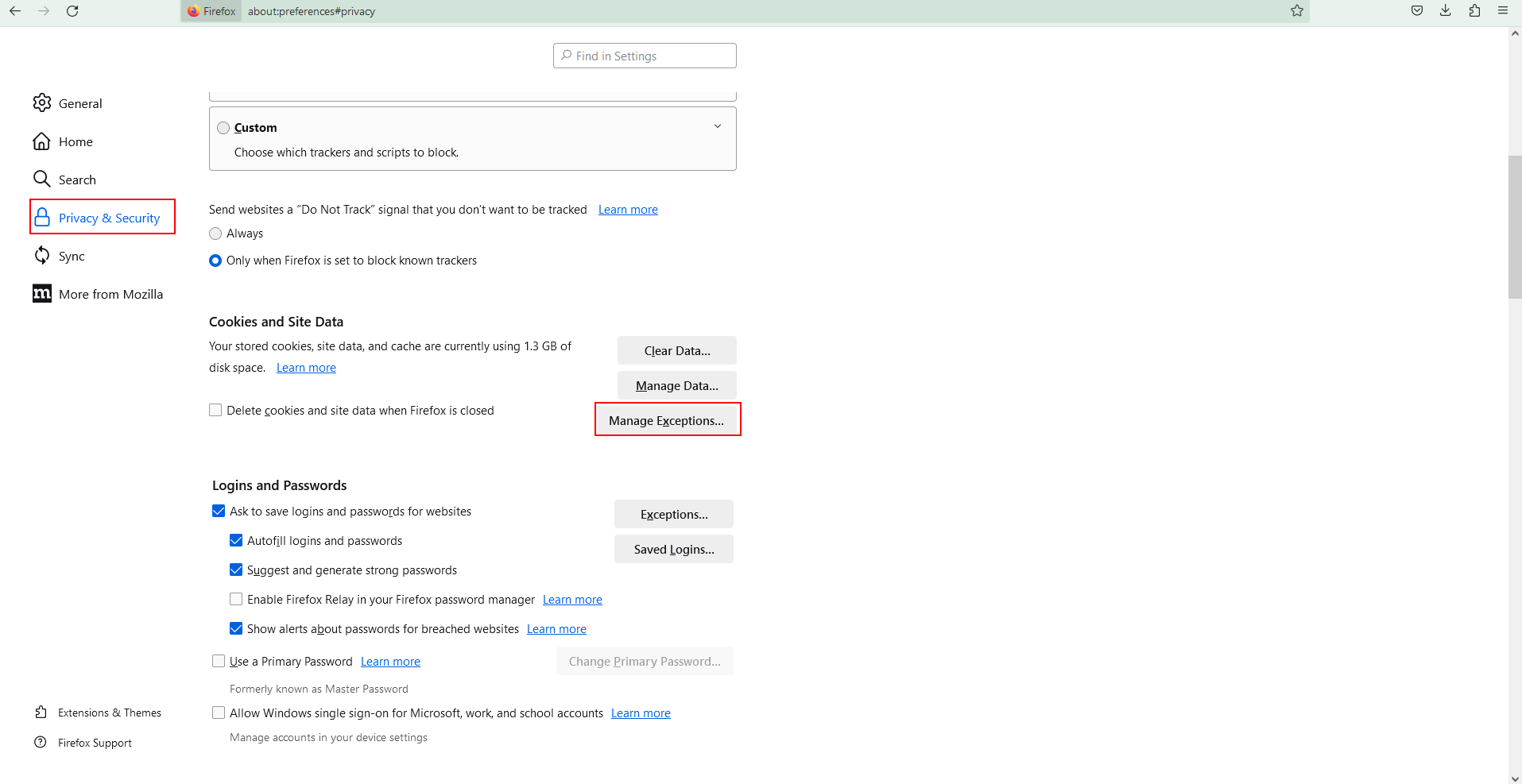 - Gå ner på sidan tills ni hittar Cookies and Site Data och klicka på Manage Exceptions.