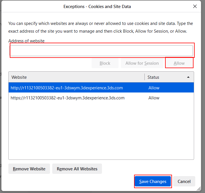 - Under Adress of website skriver ni in r1132100503382-eu1-3dswym.3dexperience.3ds.com och trycker Allow.
