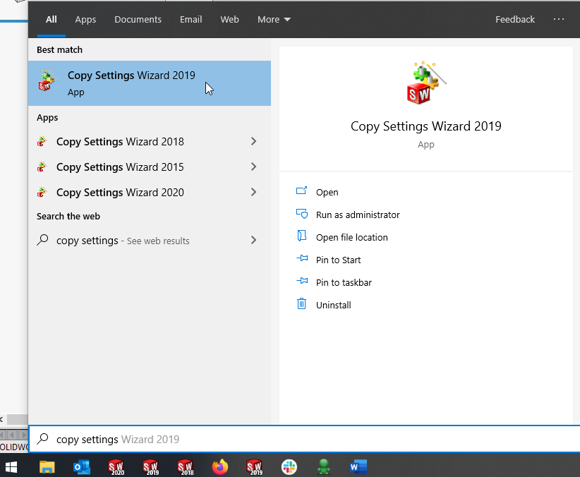 Snart är det dags för att uppgradera till 2020. Är du en person som har skräddarsytt hela ditt solidworks och vill gärna spara din inställningar? Du vet väl om solidworks copy settings wizard? Du kan hitta detta lilla extra program som följer med solidworks genom att söka på “copy settings wizard” i windows sökfält. Progammet går igenom stegen för dig och sparar en text fil där du vill. Samma verktyg använder du sen för att infoga dina inställningar. Tänk också på att den version utav solidworks du vill infoga inställningarna till ska du köra motsvarande version utav verktyget. Dvs kör copy verkyget 2020 om du vill infoga inställningarna till solidworks 2020.