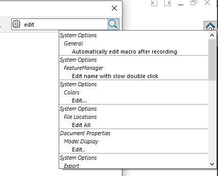 Mitt första tips för solidworks system options är att man kan söka på inställningarna inuti i system options fönstret uppe till höger. Samt klicka på dom olika förslagen som kommer upp och komma till den inställningen.