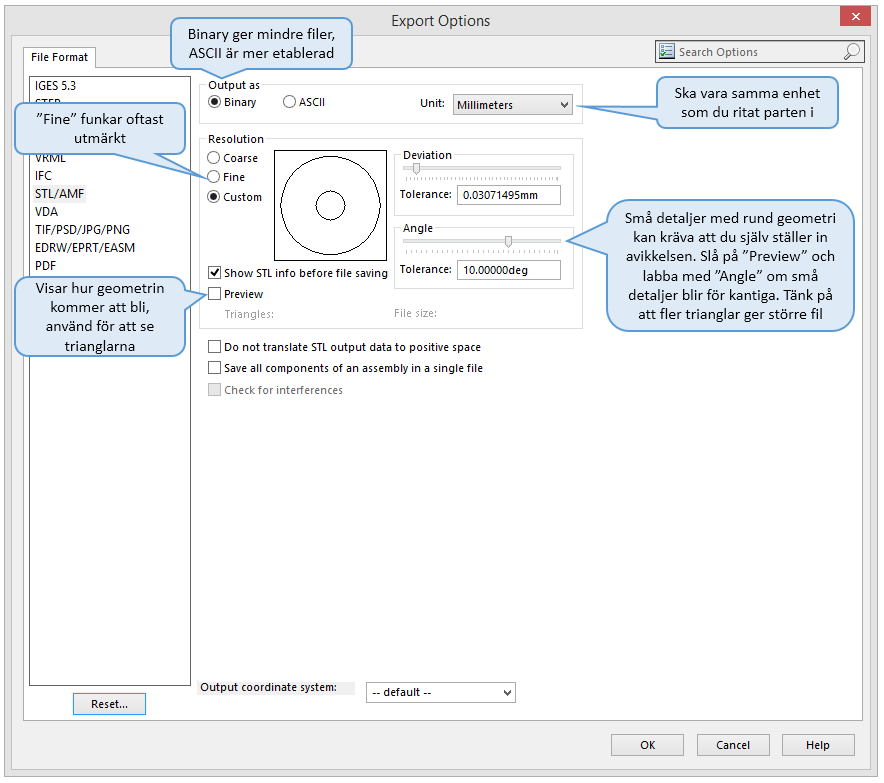 Här på jobbet så har den värsta hysterin kring vår nya 3D-printer lagt sig. Det betyder dock inte att vi är fullärda utan vi fortsätter pressa stackarn till och bortanför gränsen för vad den klarar. Det innebär att vi ibland printar saker med pyttesmå detaljer och då kan det vara bra att känna till några inställningar i SOLIDWORKS.När man sparar en fil i STL-format för att sedan plocka in i beredningsprogrammet för 3D-printern så finns det en möjlighet att påverka hur noggrann STL-filen blir. Om små detaljer försvinner eller om man tycker att runda hål inte blir runda så beror det på att STL-filen innehåller för få trianglar för att representera geometrin. Detta ändras enkelt i samband med att man sparar filen och det finns till och med en förhandsgranskningsfunktion som underlättar.