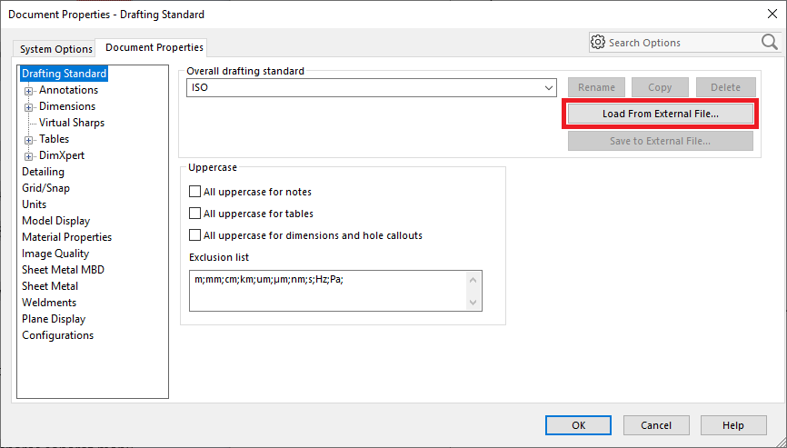 Nu kan du öppna dokumentet igen och ladda in ritstandardfilen (*.sldstd) med Load from external file, för att anpassa standardteckensnitten. Däremot måste titelblocket på ritningen redigeras manuellt då det inte ändras av ritstandarden. Är det många ritningar som ska redigeras kan du också spara ut en Sheet format mall med förbättringarna i titelblocket.
