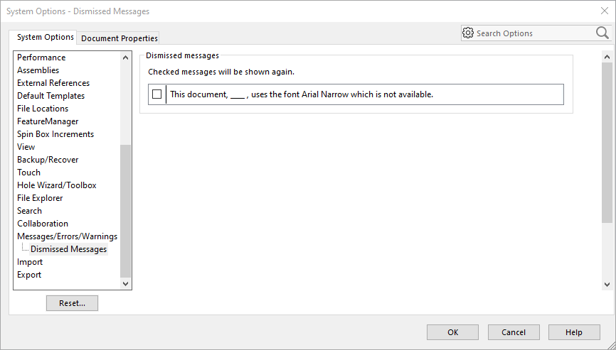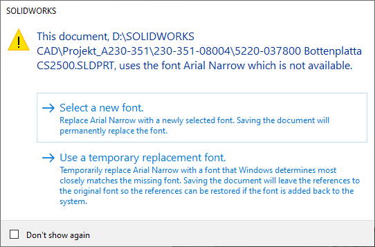 Allt som oftast får vi ett meddelande från SOLIDWORKS där något mer eller mindre viktigt beslut ska fattas och om det tillhör det senare möjligheten att välja “Don’t show again” för. Men saknas den normala varianten av teckensnittet så ersätter SOLIDWORKS det automatiskt med kursiv eller fet variant utan något felmeddelande.