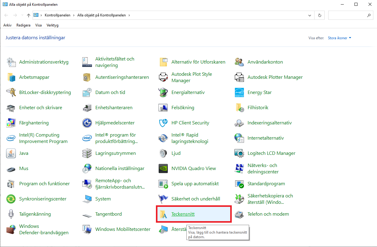Windows kontrollpanel – Teckensnitt – Visa/Döj