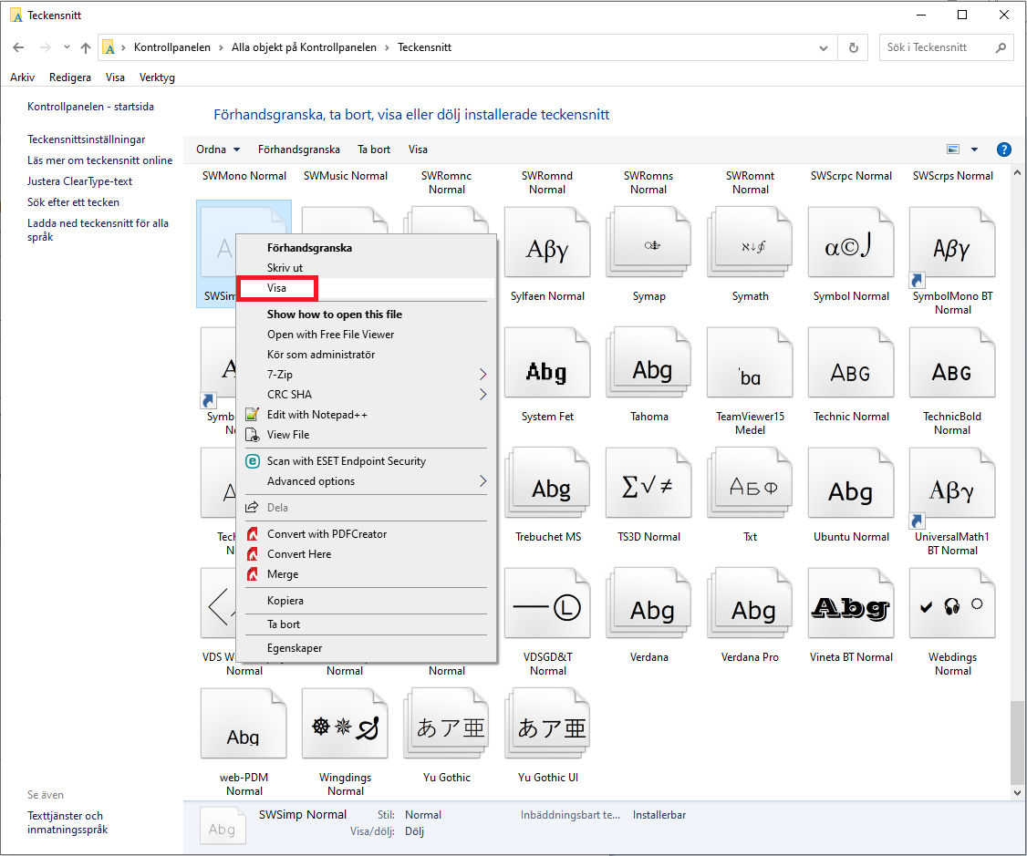 - Teckensnittet kan vara dolt i Windows kontrollpanel – Teckensnitt, det går att visa igen genom att högerklicka och välja “Visa”.