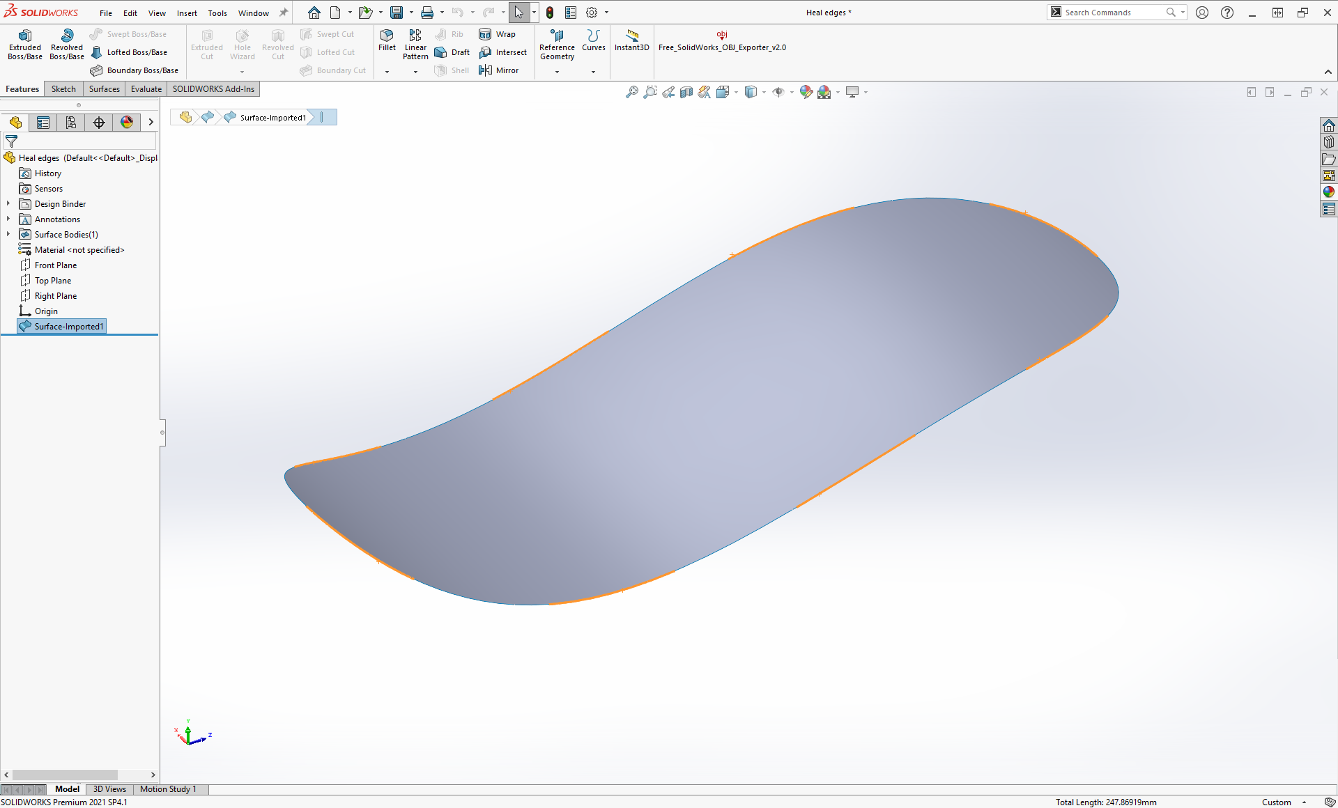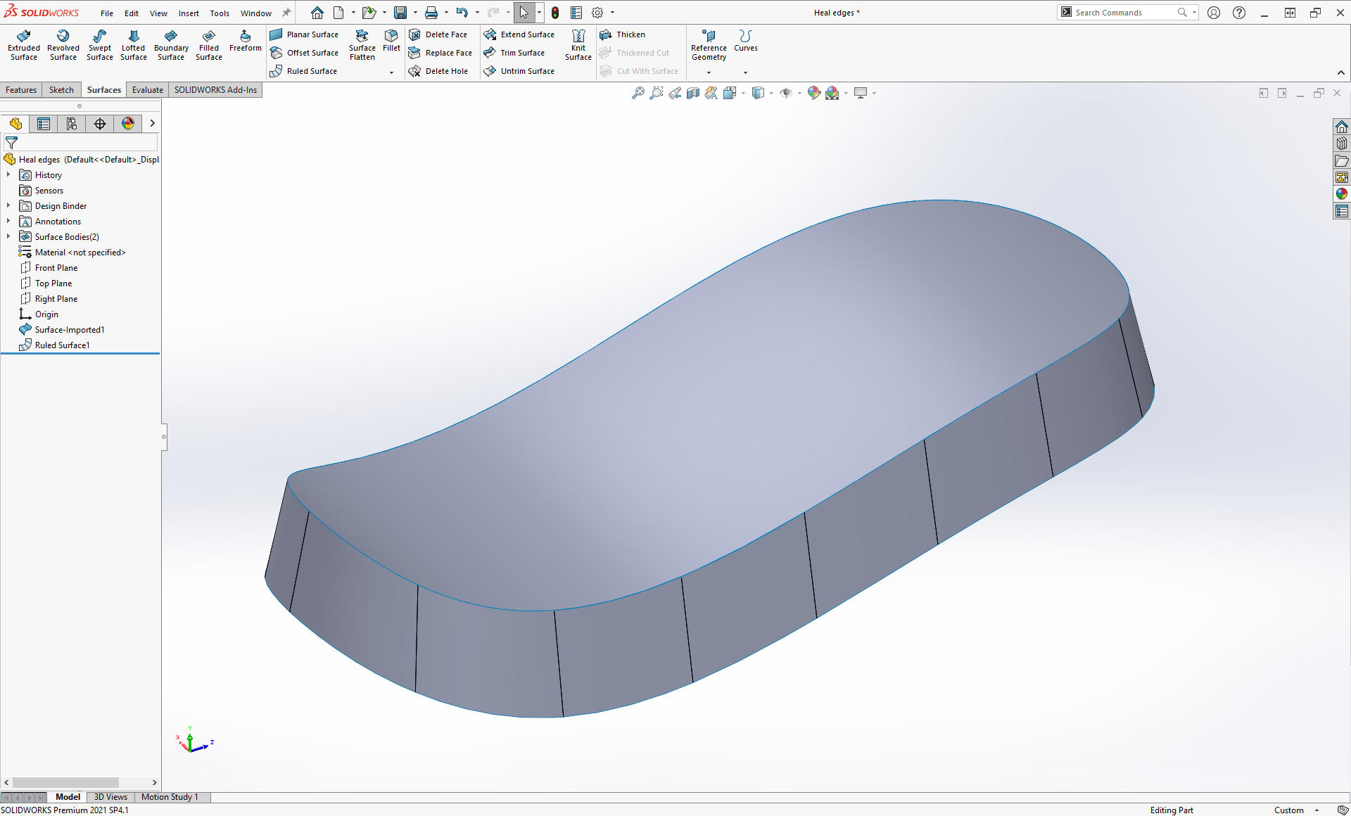 Om vi igen provar att skapa en ny yta utifrån den nu ensamma kanten, igen med kommandot Ruled surface, ser vi att resultatet blir ett annat. Borta är det upphackade lapptäcket, och istället har vi en enda, fin, lättarbeta yta.