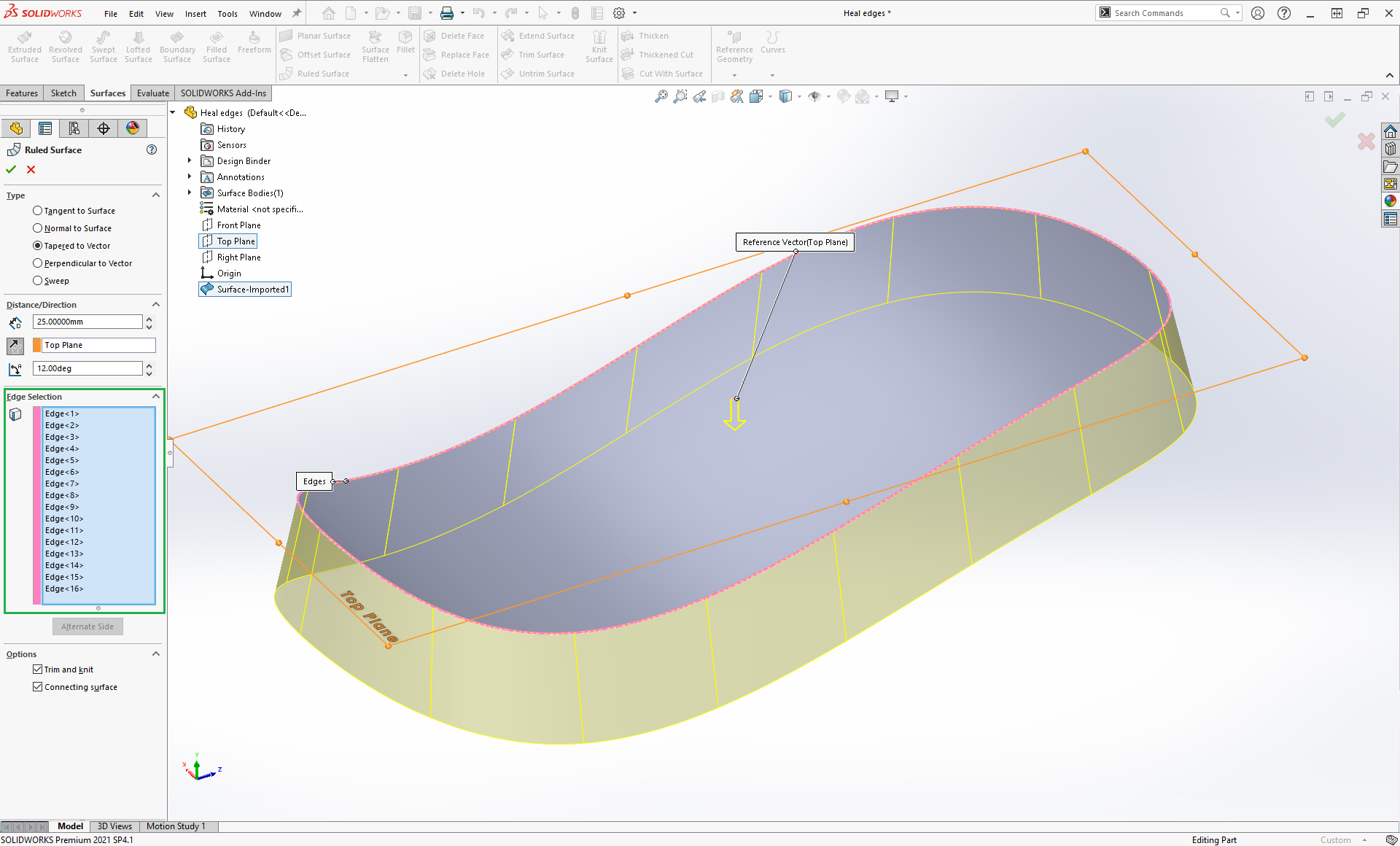 Det första är vilken yta du vill utföra operationen på. Därefter har du två inställningar till, Angle tolerance och Edge length tolerance. Den första säger hur stor vinkelavvikelse vi kan tillåta mellan två kanter och ändå få dem hopslagna, den andra säger hur långa kanterna maximalt får vara för att bli hopslagna. Vanligen är det kortare kanter vi är intresserade av att slå ihop, och den här inställningen ger oss kontroll över detta. I den nedgråade rutan längst ner ser vi resultatet; i vårt fall har 16 kanter slagits ihop till en enda.