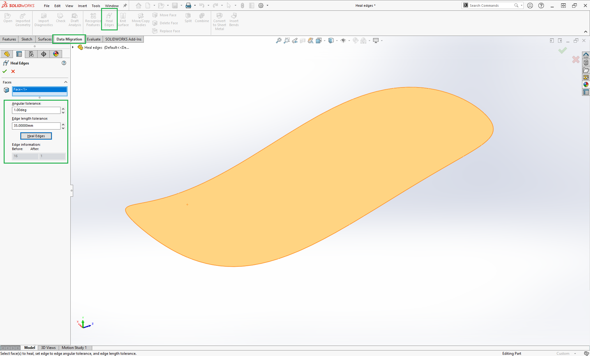 Vad kan vi då göra åt detta? En funktion som inte alla känner till är kommandot Heal Edges. Du hittar det antingen i verktygsraden, under insert – faces – Heal Edges …, eller så plockar du fram knappsatsen Data Migration då du finner en knapp. Med kommandot igång är det tre saker du behöver ställa in.