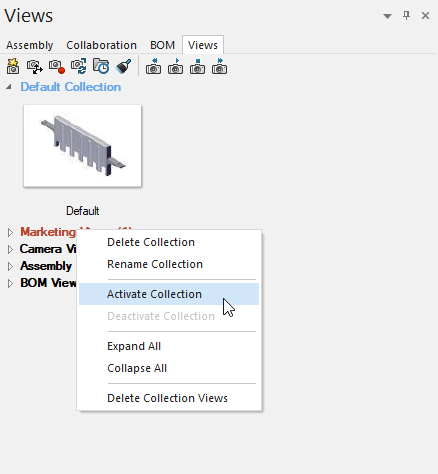 Vi kan styra vilken mapp som är den aktiva mappen (där nyskapade vyer automatiskt läggs till) genom att högerklicka på en mapp och välja Activate Collection. Den aktiva samlingen visas då med blå textfärg.
